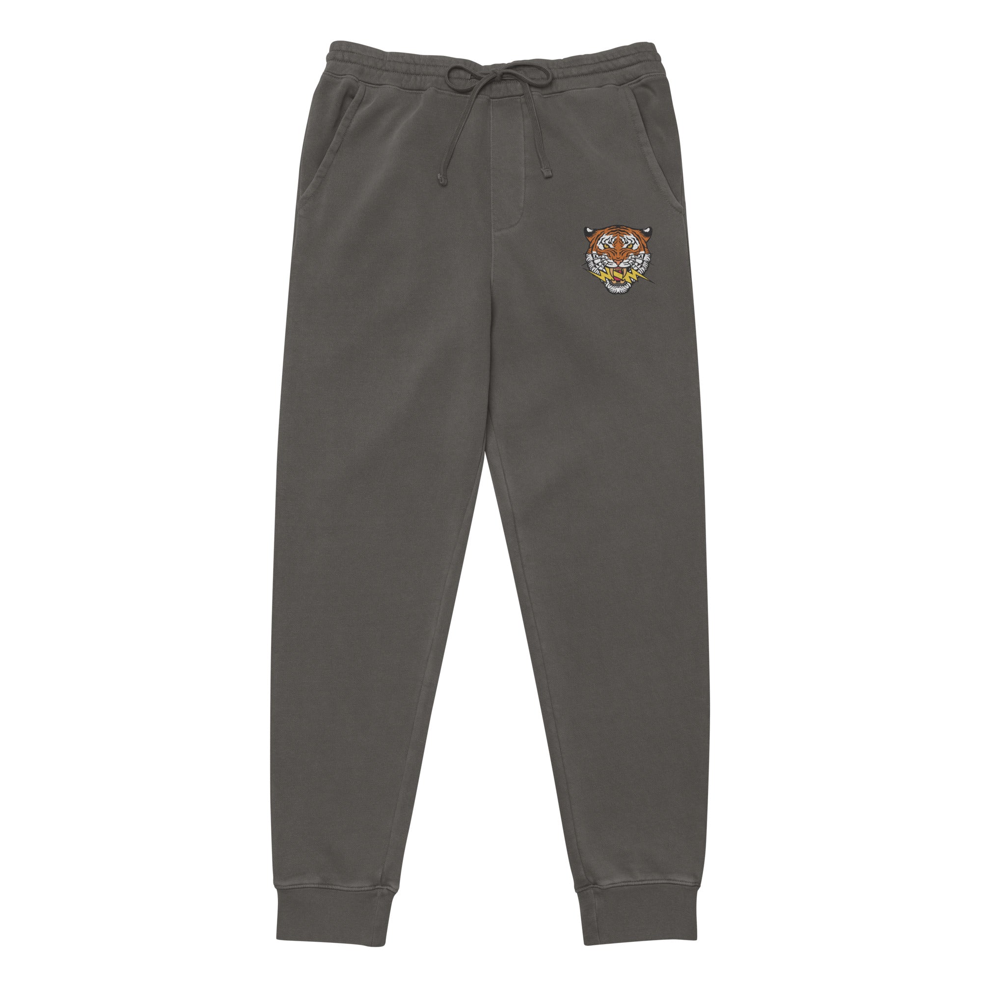 Strike a balance between fierce and chill with the Electric Tiger Embroidered Joggers These pigment-dyed sweatpants give you that effortless celebrity off-duty vibe, while the bold electric bolt and tiger design lets your wild side shine. Each pair has a unique washed-out look, thanks to the dyeing process, making them as one-of-a-kind as your style. With front and back pockets, an elastic waistband, and adjustable drawstrings, these joggers are all about laid-back comfort with a fierce twist.